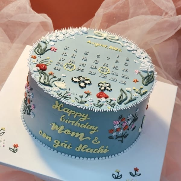 Bánh kem trang trí hoa và tờ lịch sinh nhật mẹ và bé