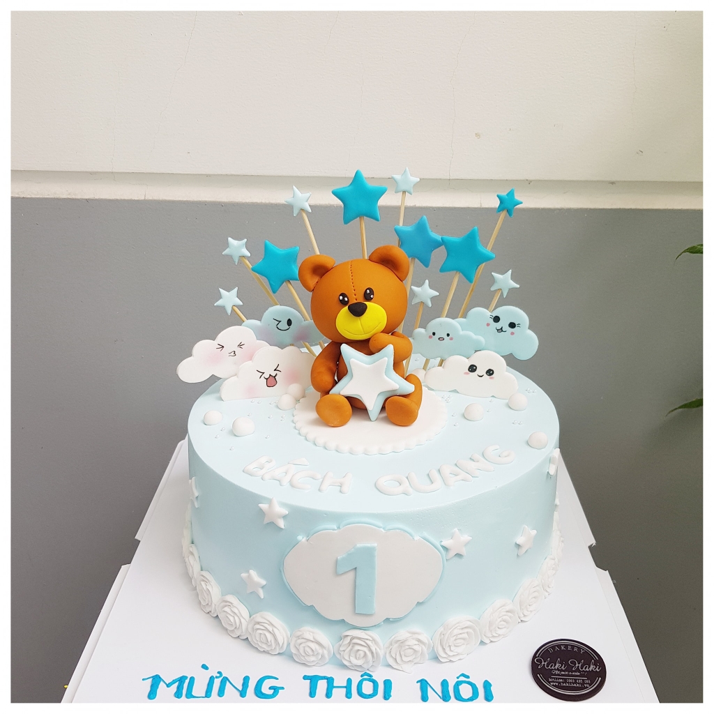 Bánh kem màu xanh với tạo hình Gấu thôi nôi bé