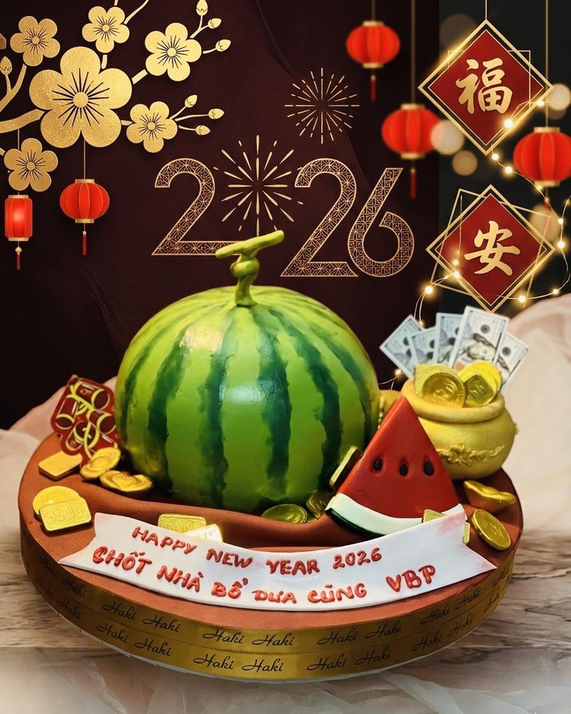 Bánh kem trang trí dưa hấu, tiền vàng cho ngày Tết